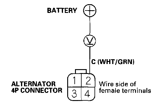 4. Measure voltage between the alternator 4P connector terminal No. 2 and the positive terminal of the battery.