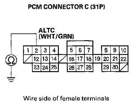 7. Check for continuity between the PCM connector C terminal No. 2 and body ground.