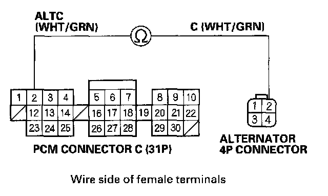 10. Check for continuity between the PCM connector C terminal No. 2 and alternator 4P connector terminal No. 2.