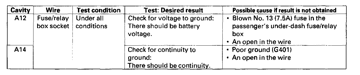4. With the passenger's multiplex control unit still disconnected, make these input tests at the passenger's under-dash fuse/relay box socket.