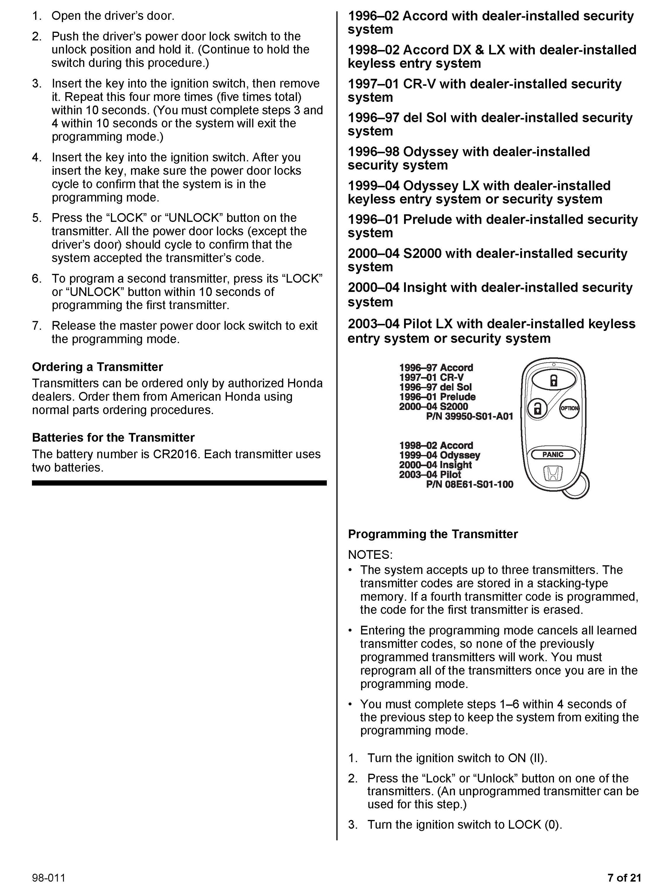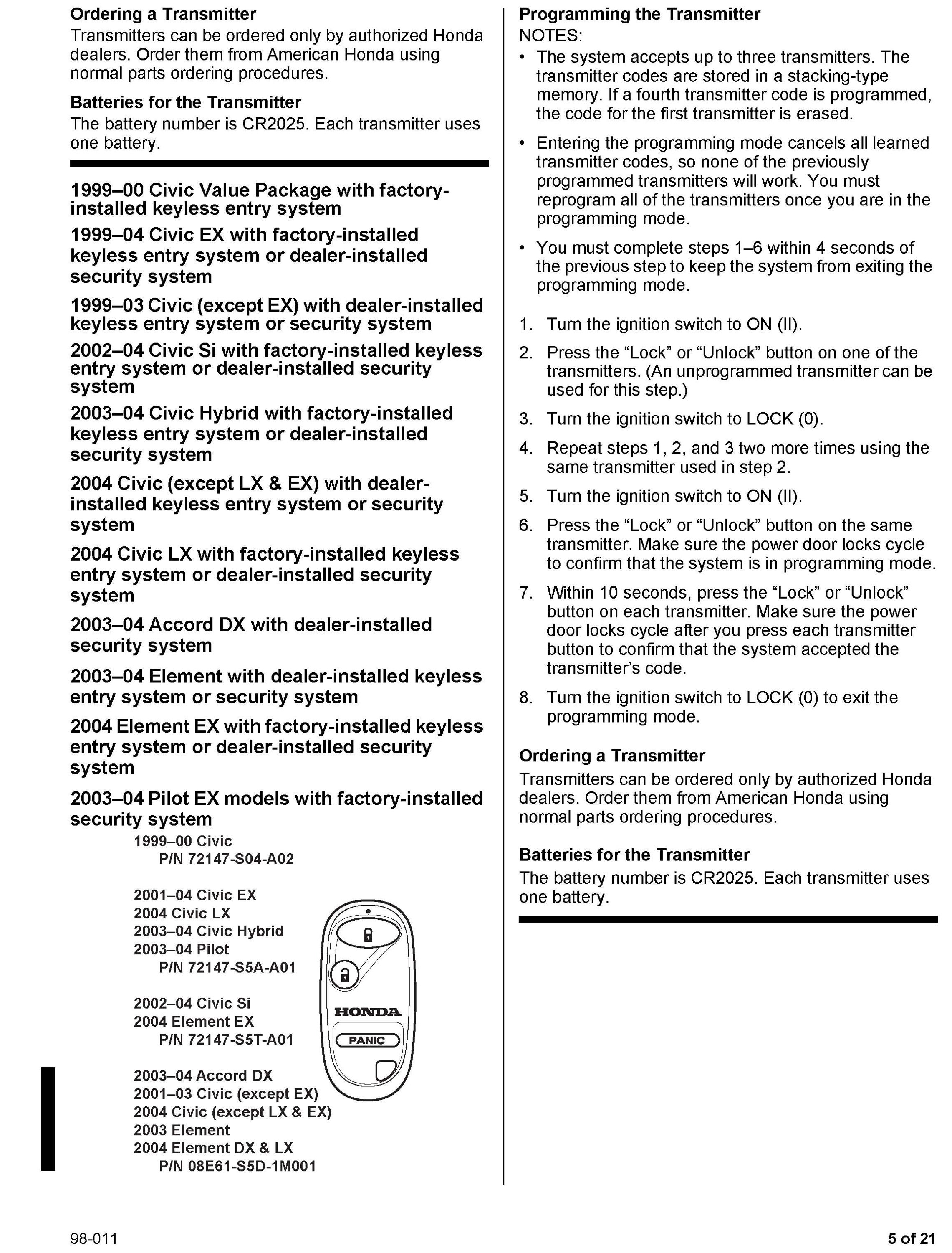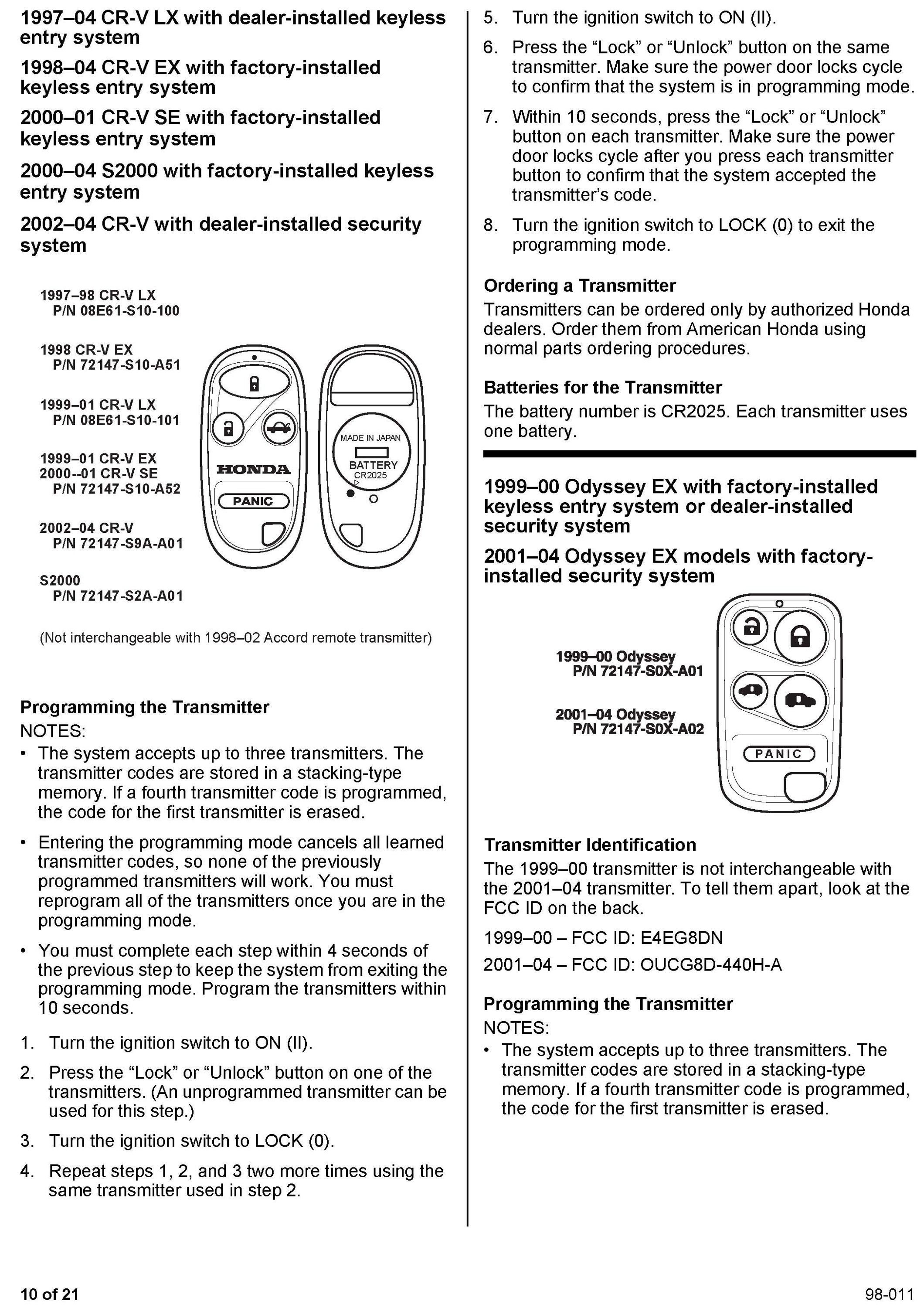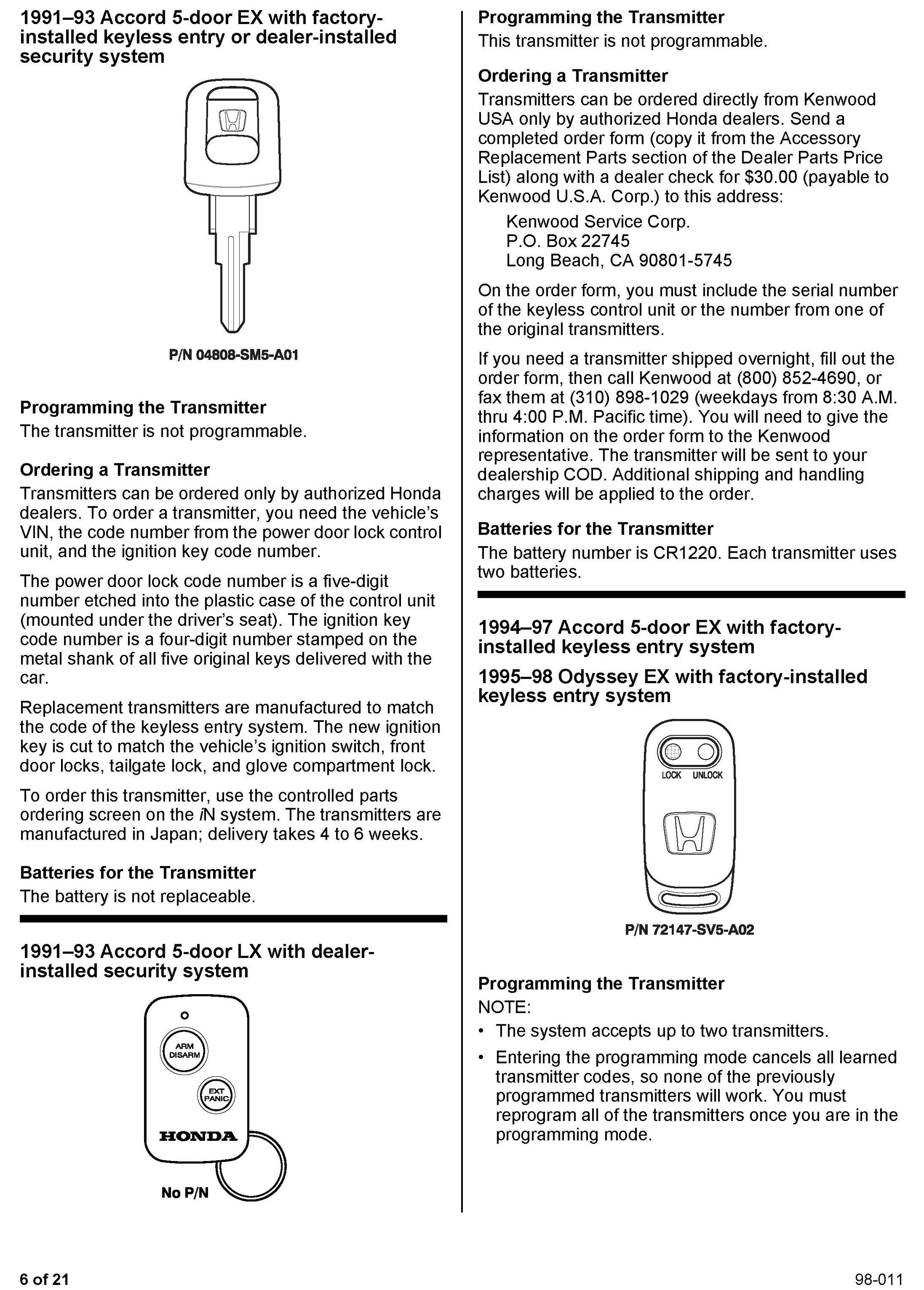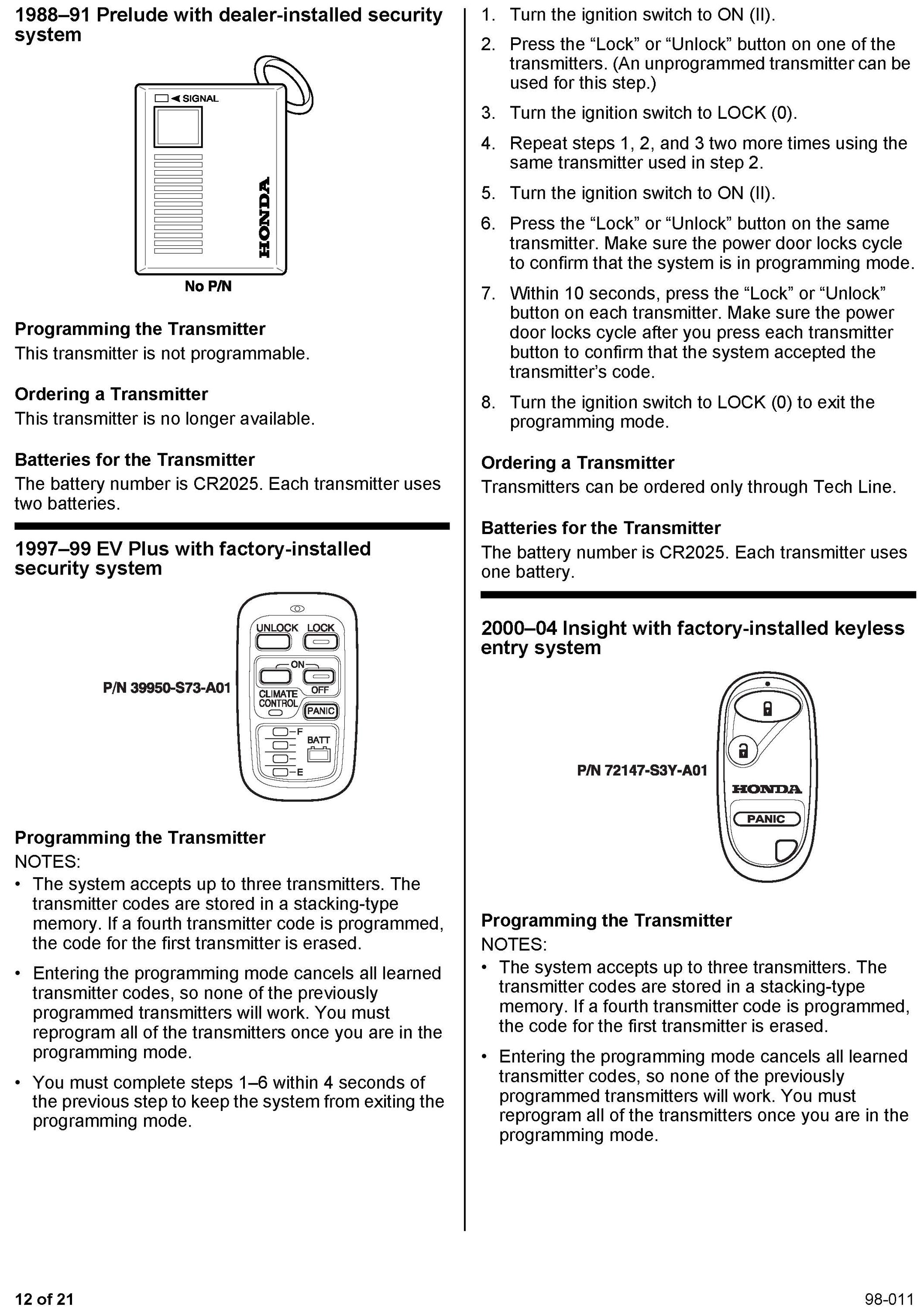 This service bulletin gives you information about keyless remote transmitters for most Honda vehicles. Each procedure describes transmitter programming (if applicable), transmitter ordering, and transmitter batteries. A remote transmitter quick reference guide starts on page 16.