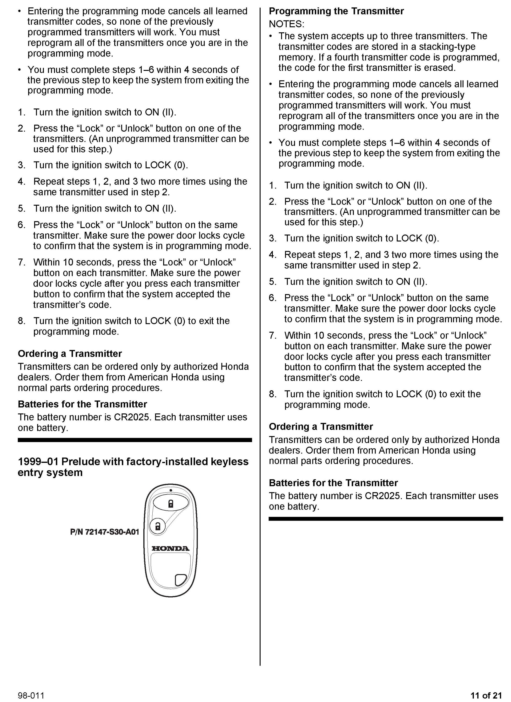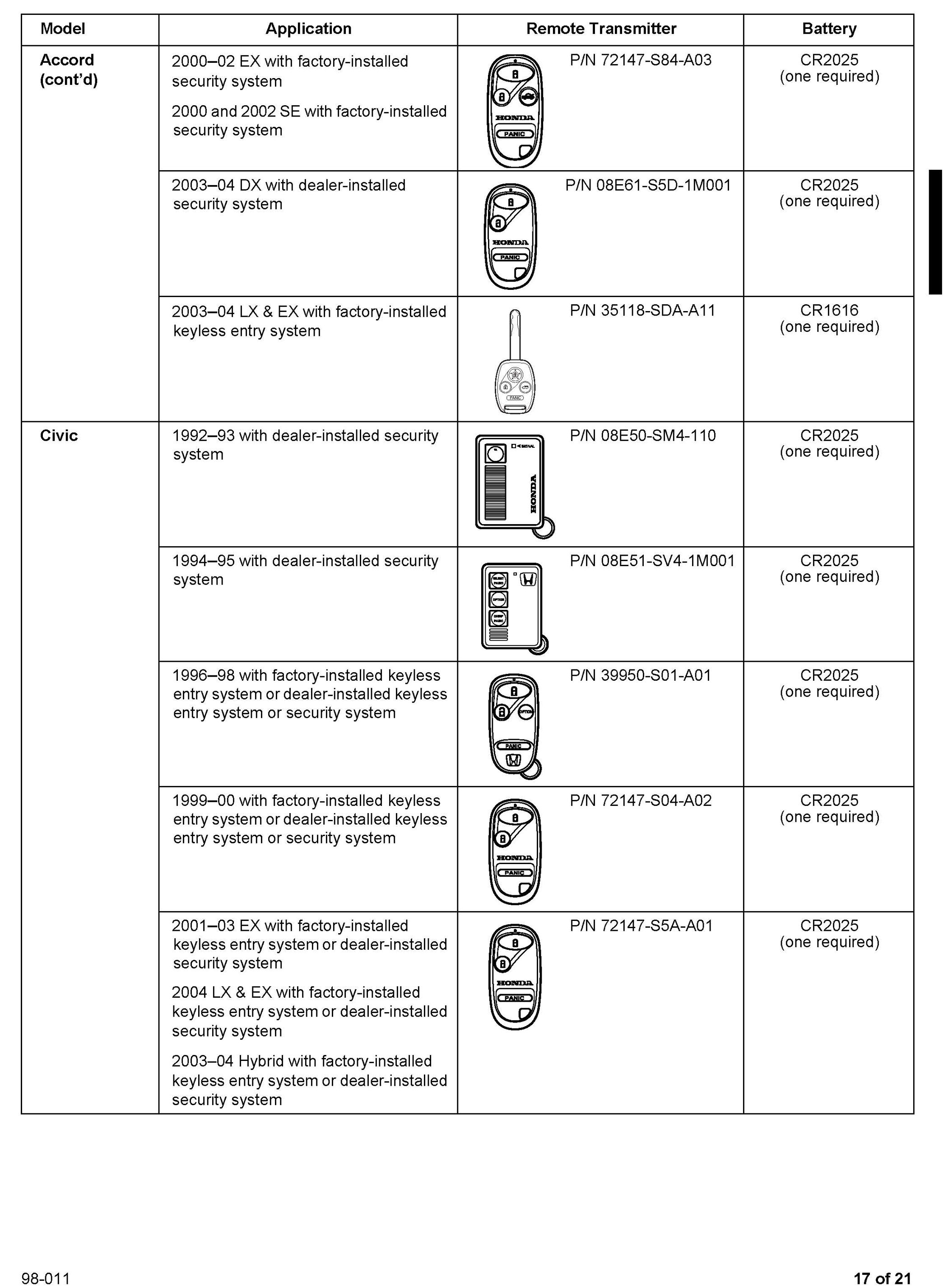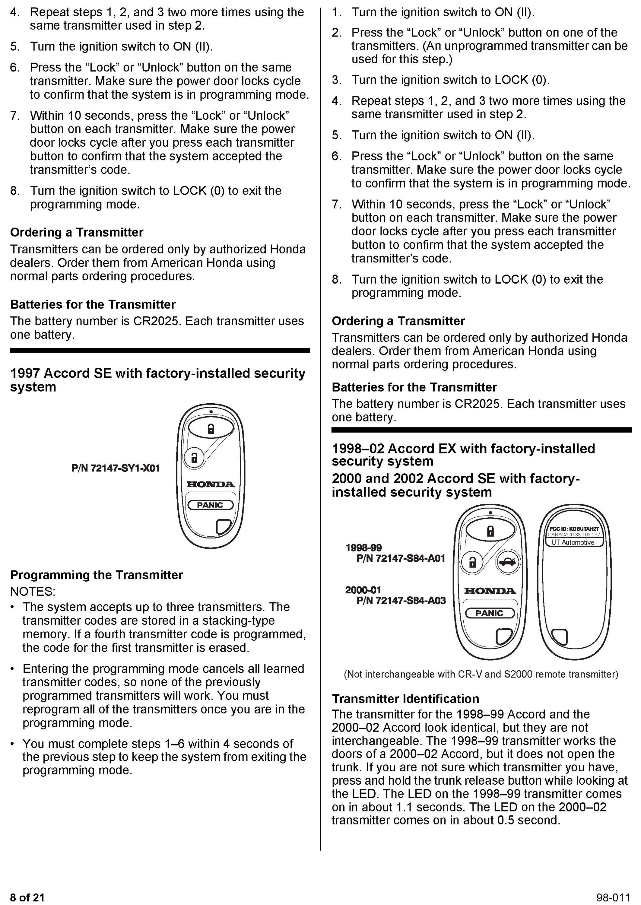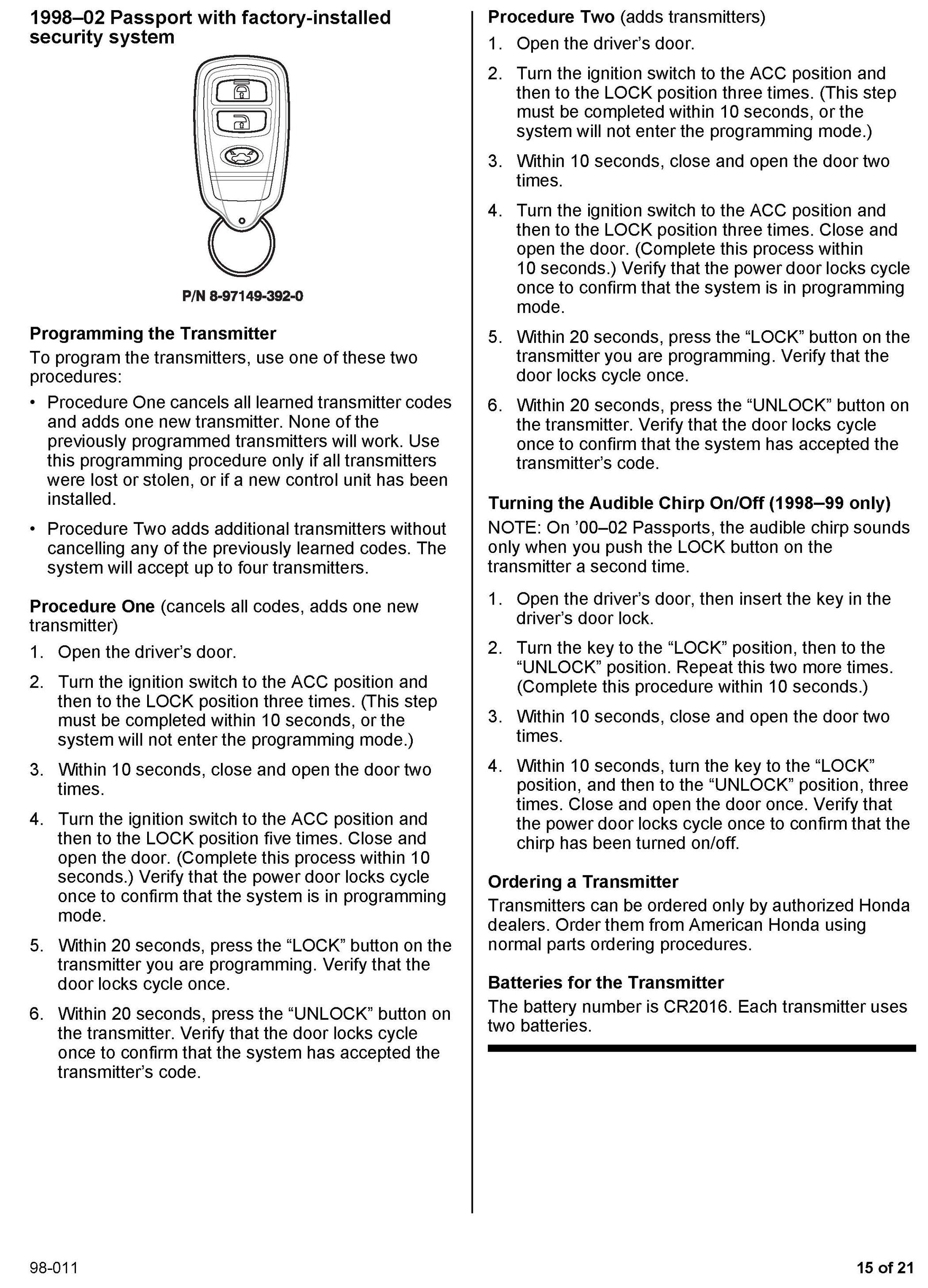 This service bulletin gives you information about keyless remote transmitters for most Honda vehicles. Each procedure describes transmitter programming (if applicable), transmitter ordering, and transmitter batteries. A remote transmitter quick reference guide starts on page 16.