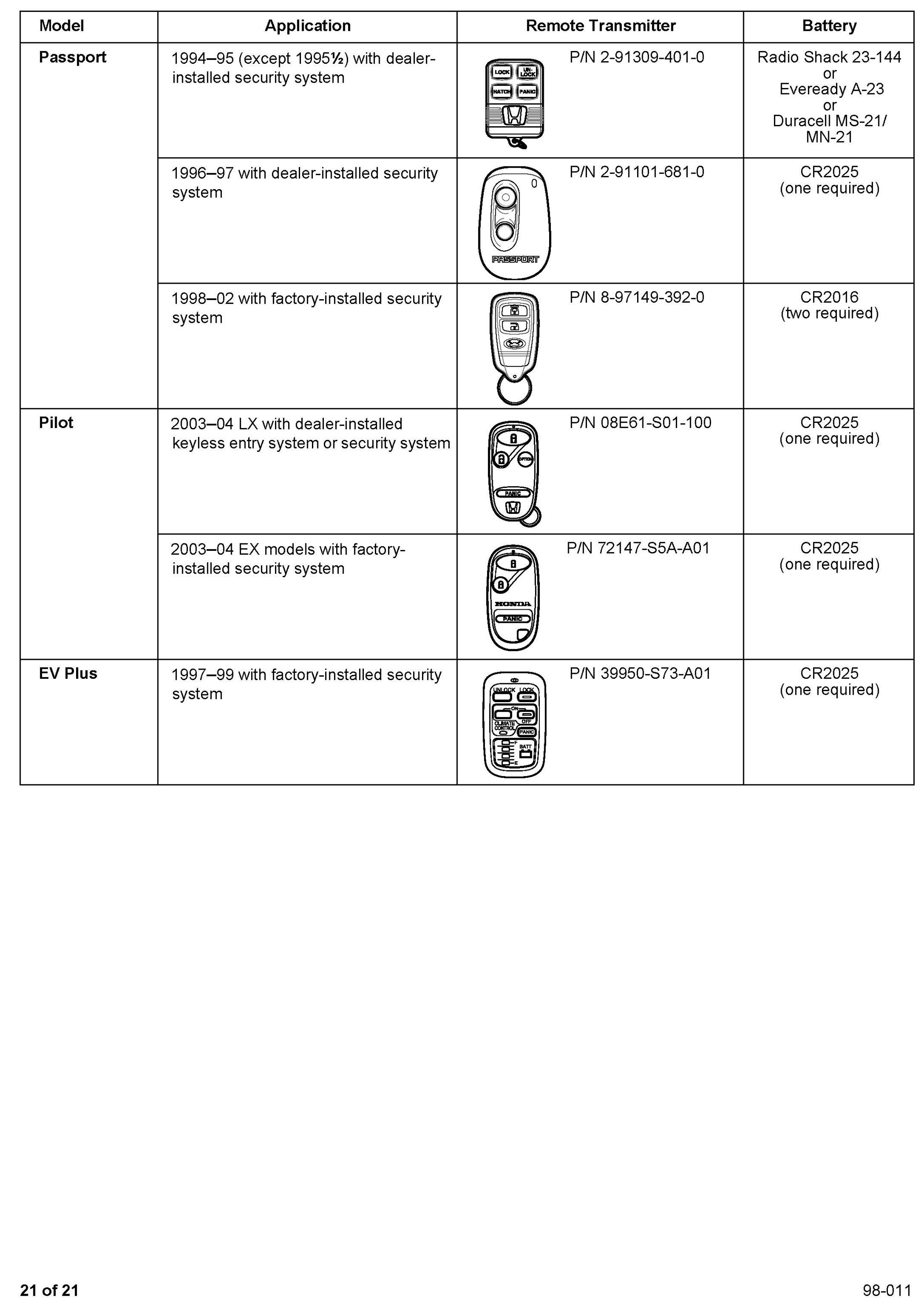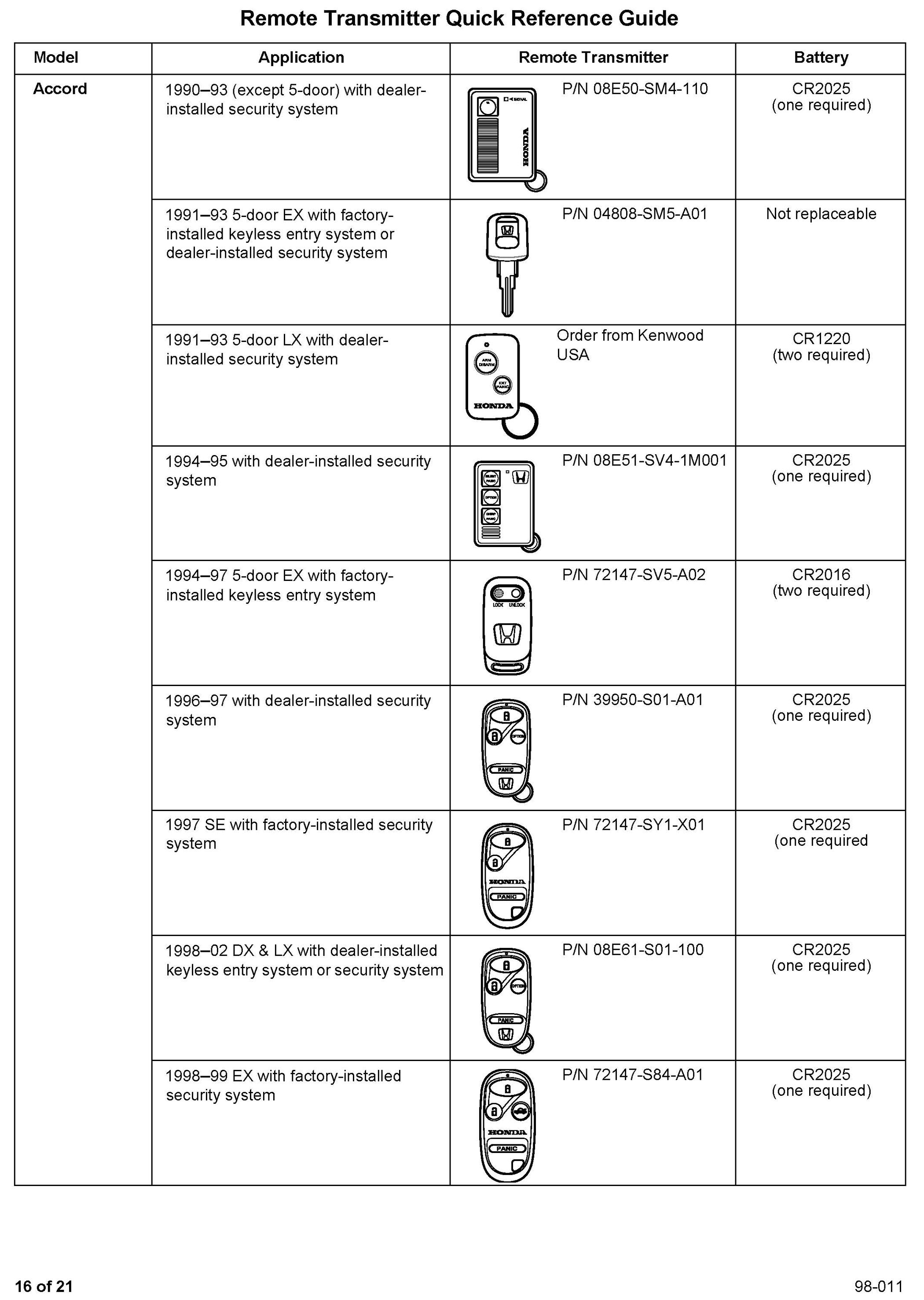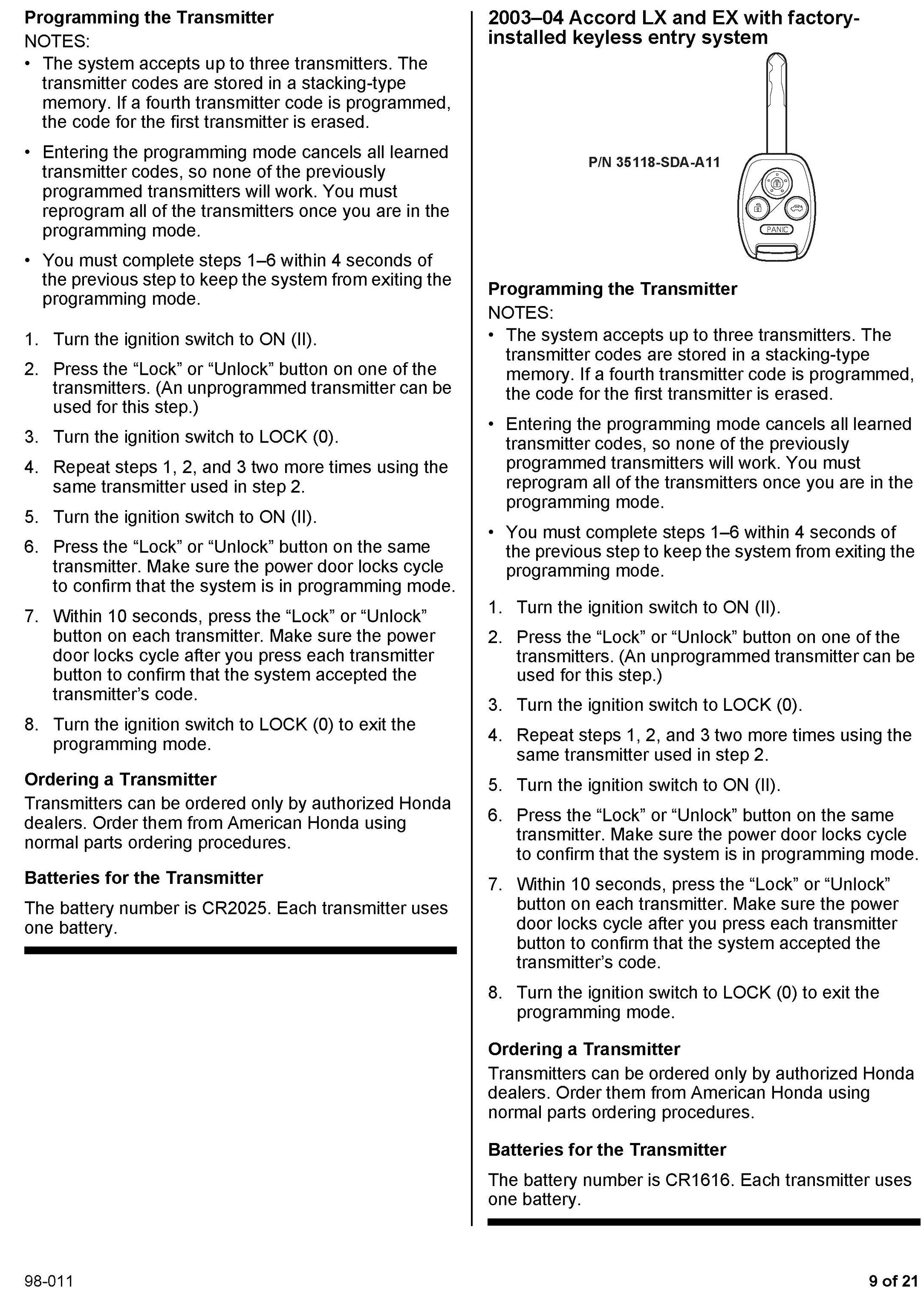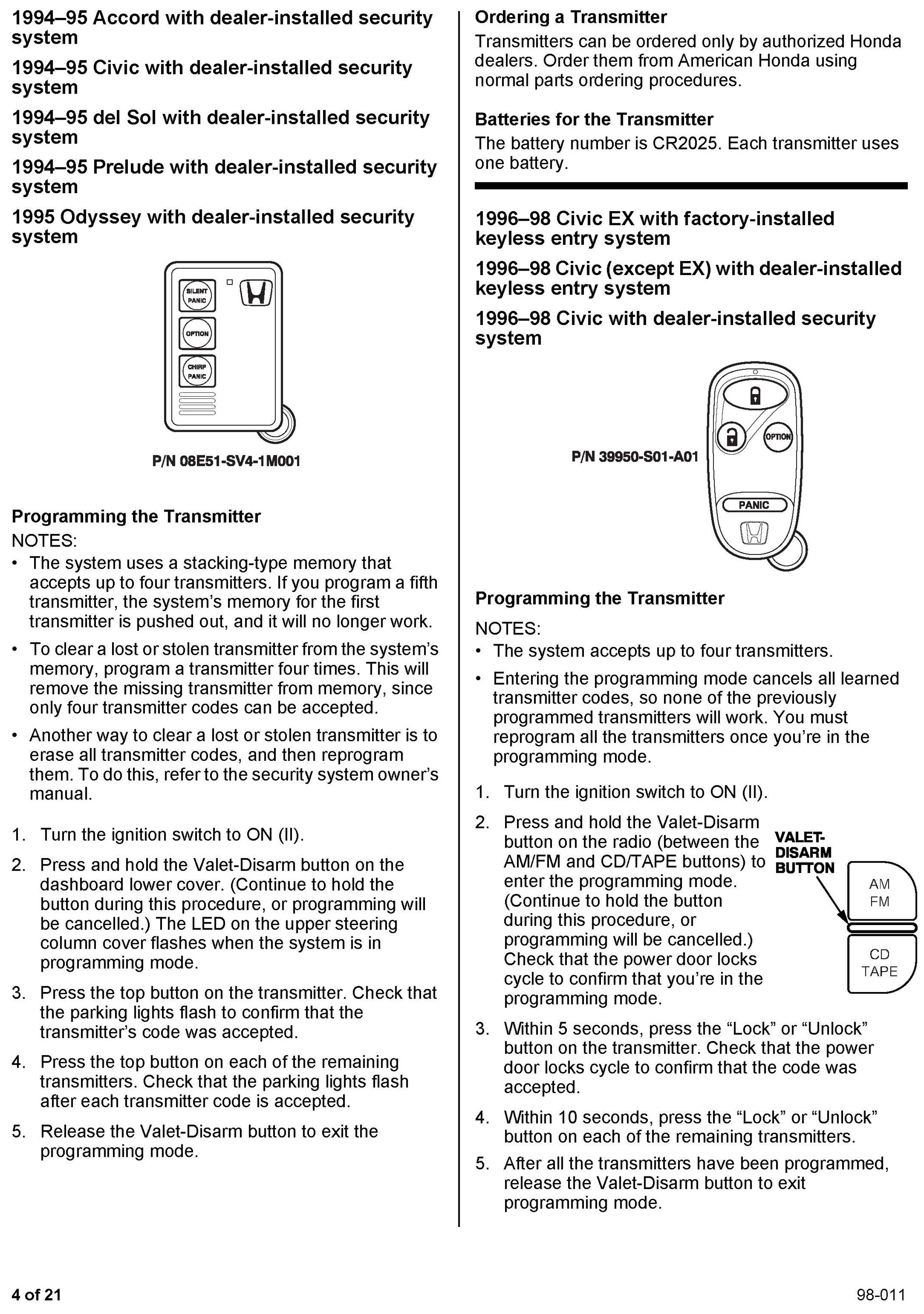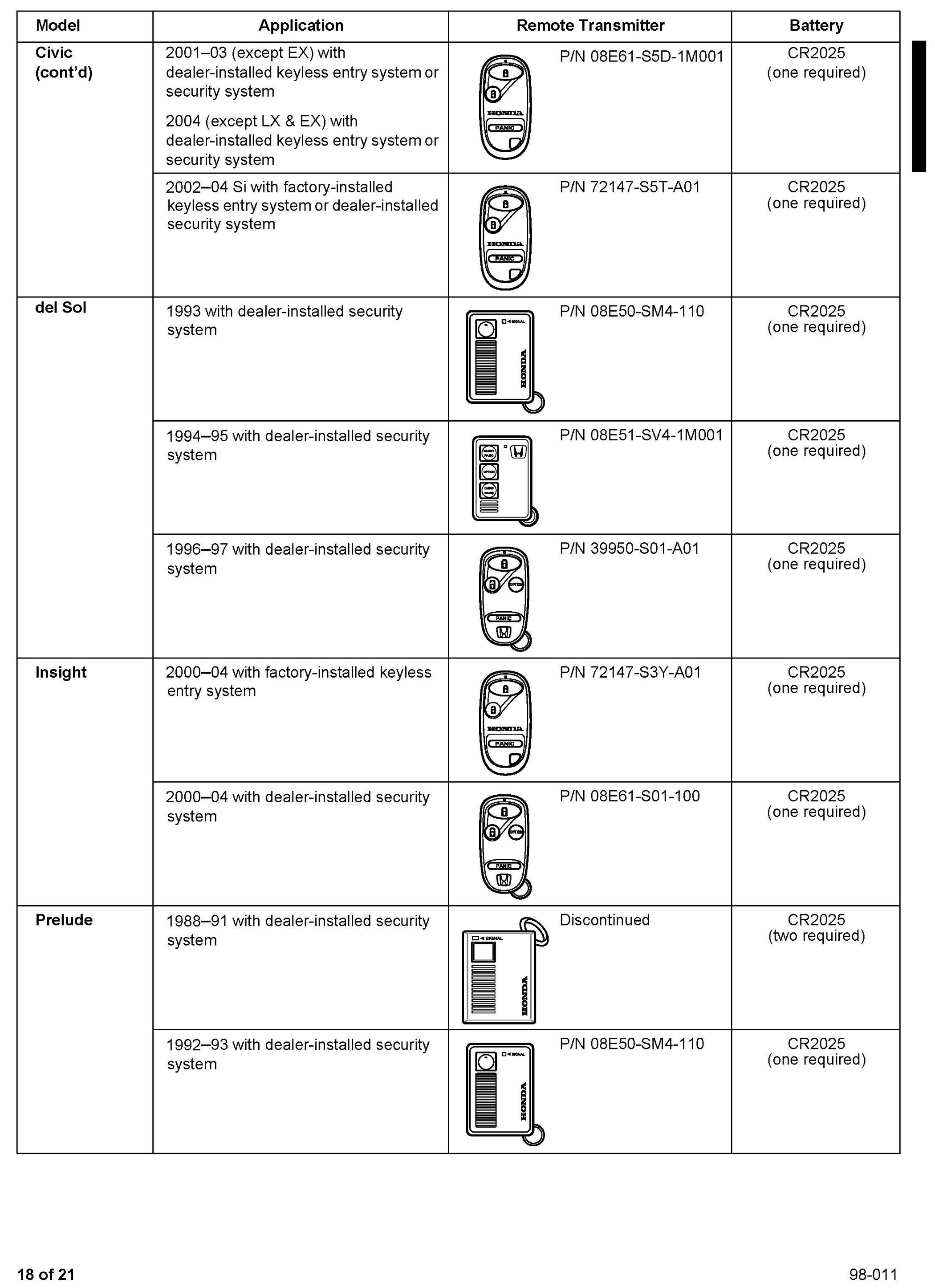 This service bulletin gives you information about keyless remote transmitters for most Honda vehicles. Each procedure describes transmitter programming (if applicable), transmitter ordering, and transmitter batteries. A remote transmitter quick reference guide starts on page 16.