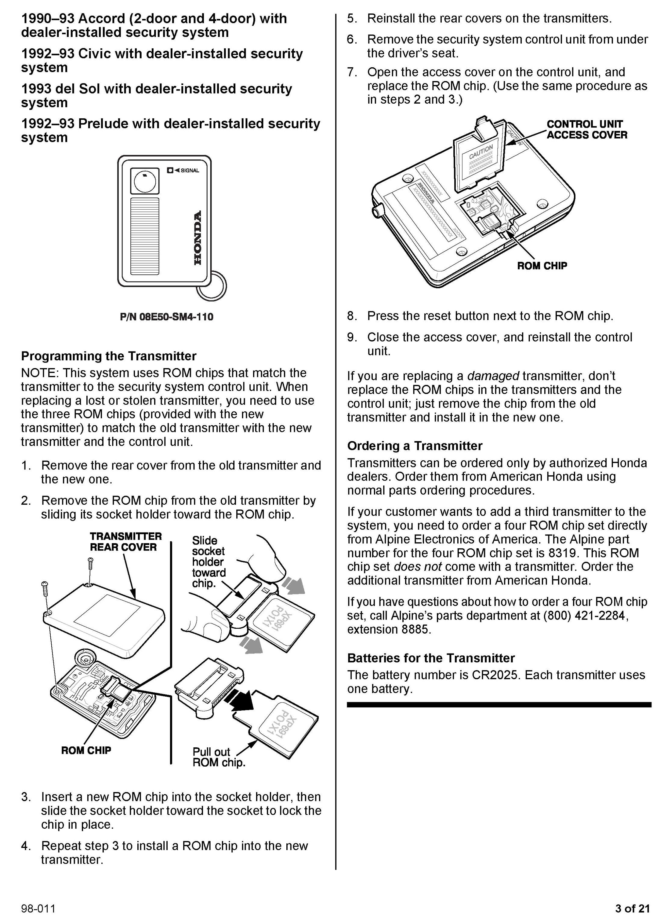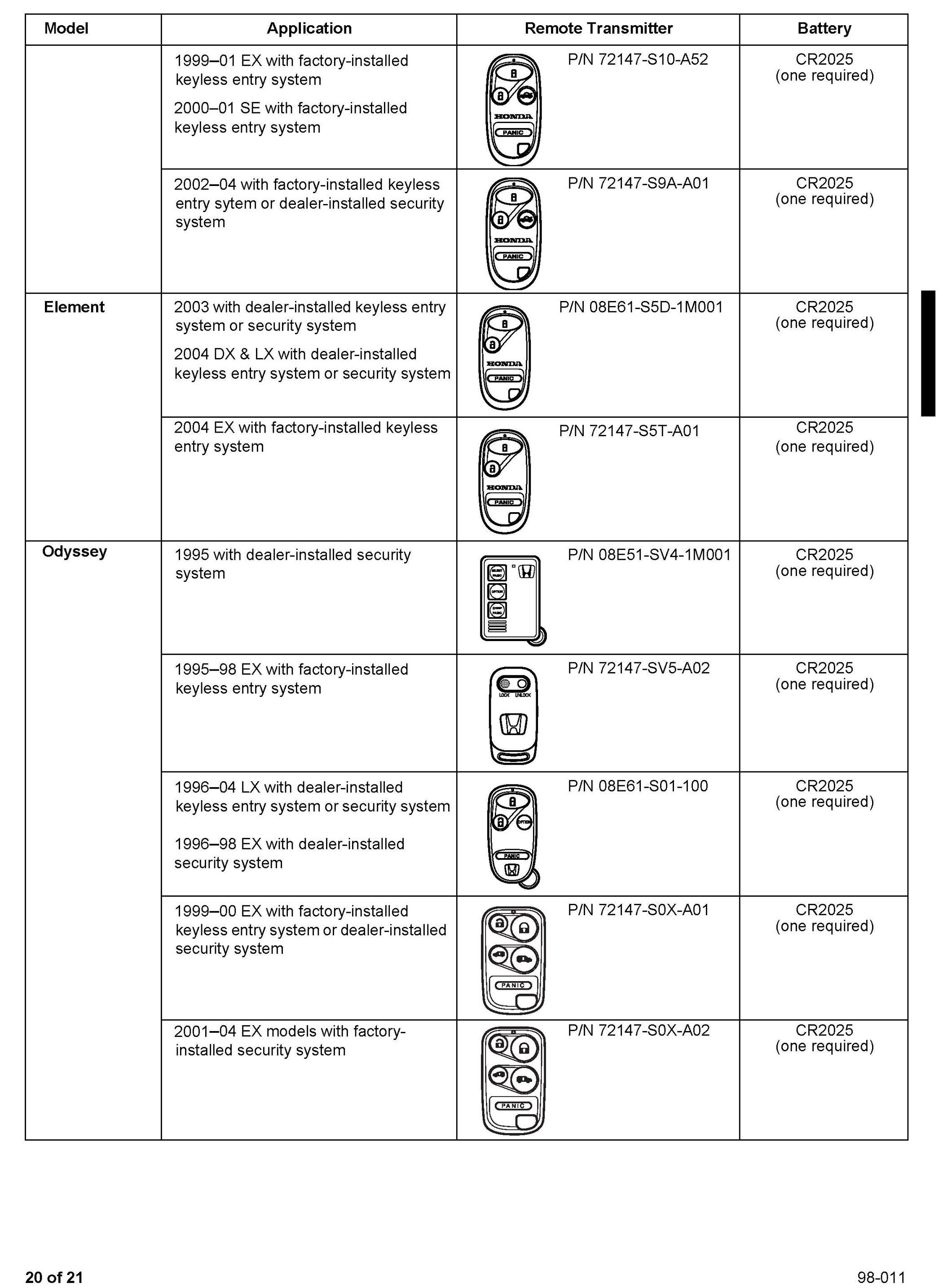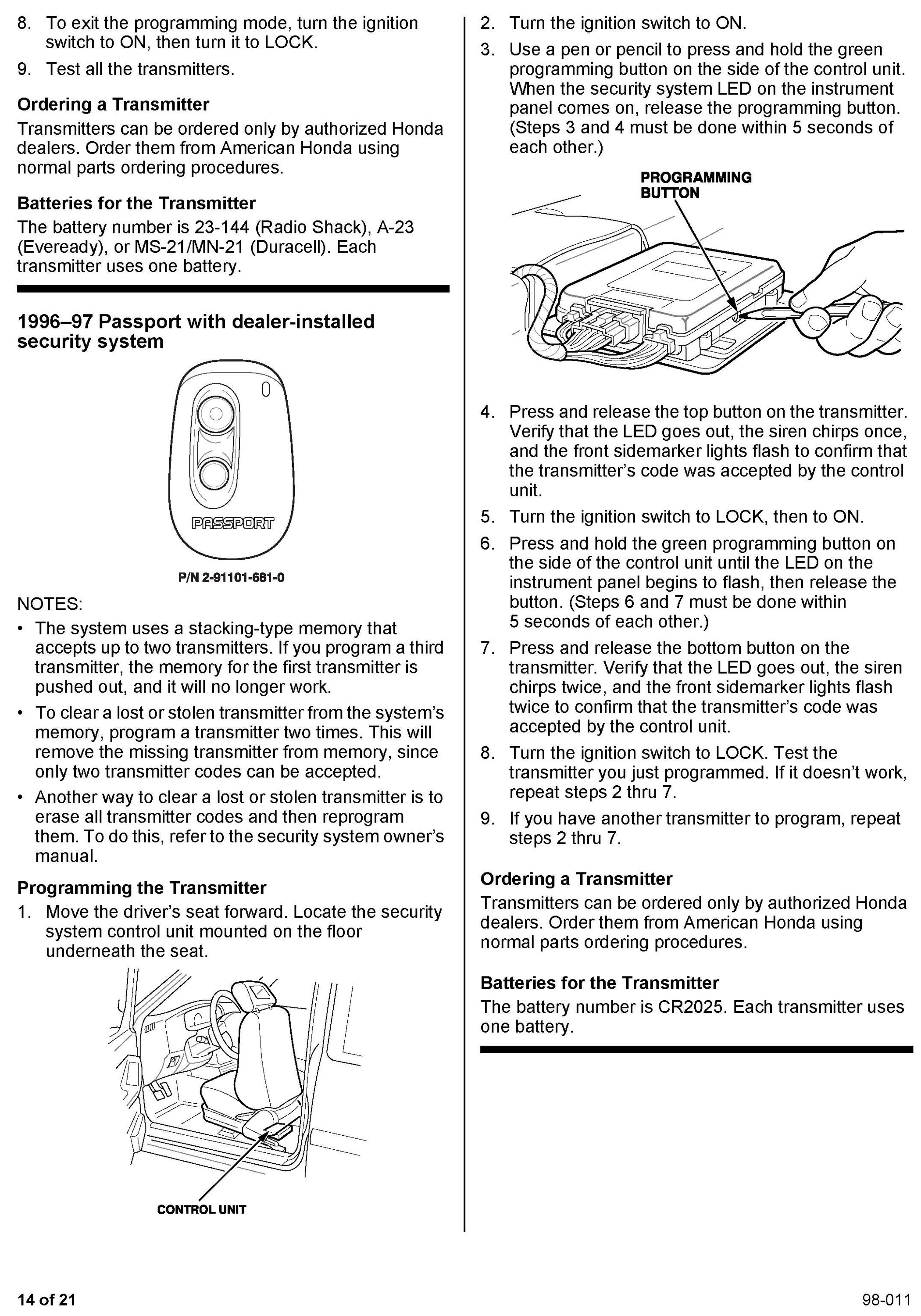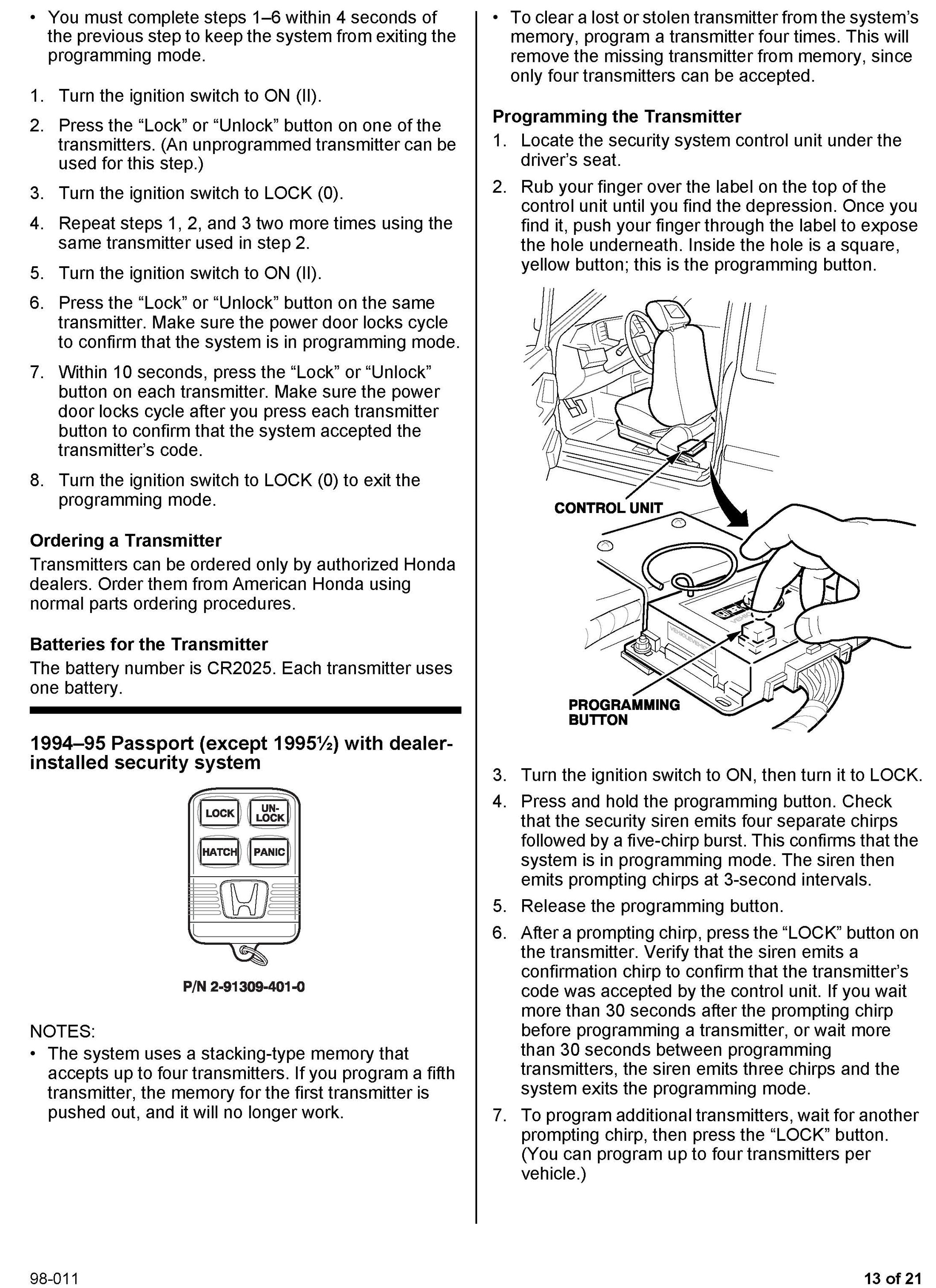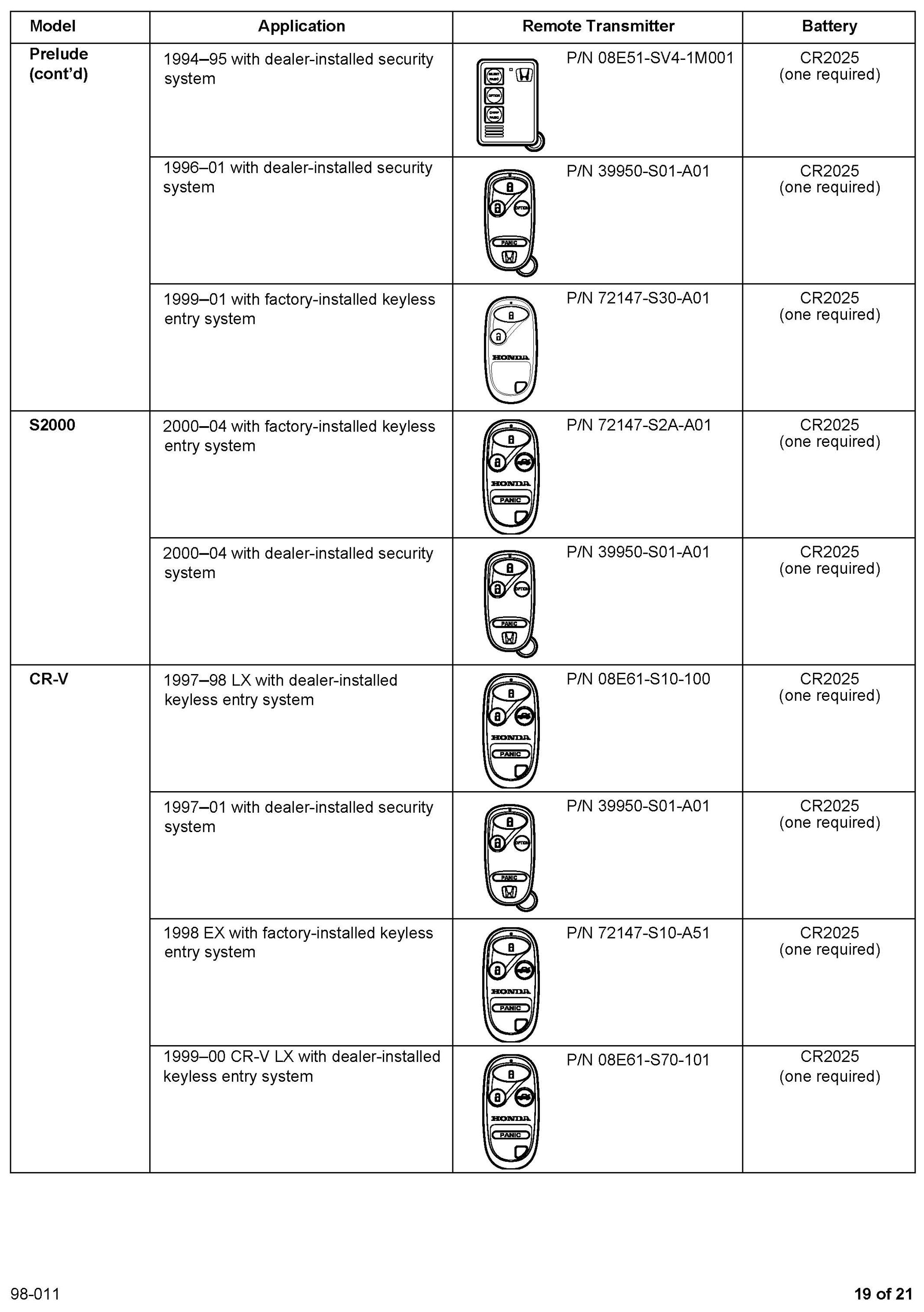 This service bulletin gives you information about keyless remote transmitters for most Honda vehicles. Each procedure describes transmitter programming (if applicable), transmitter ordering, and transmitter batteries. A remote transmitter quick reference guide starts on page 16.