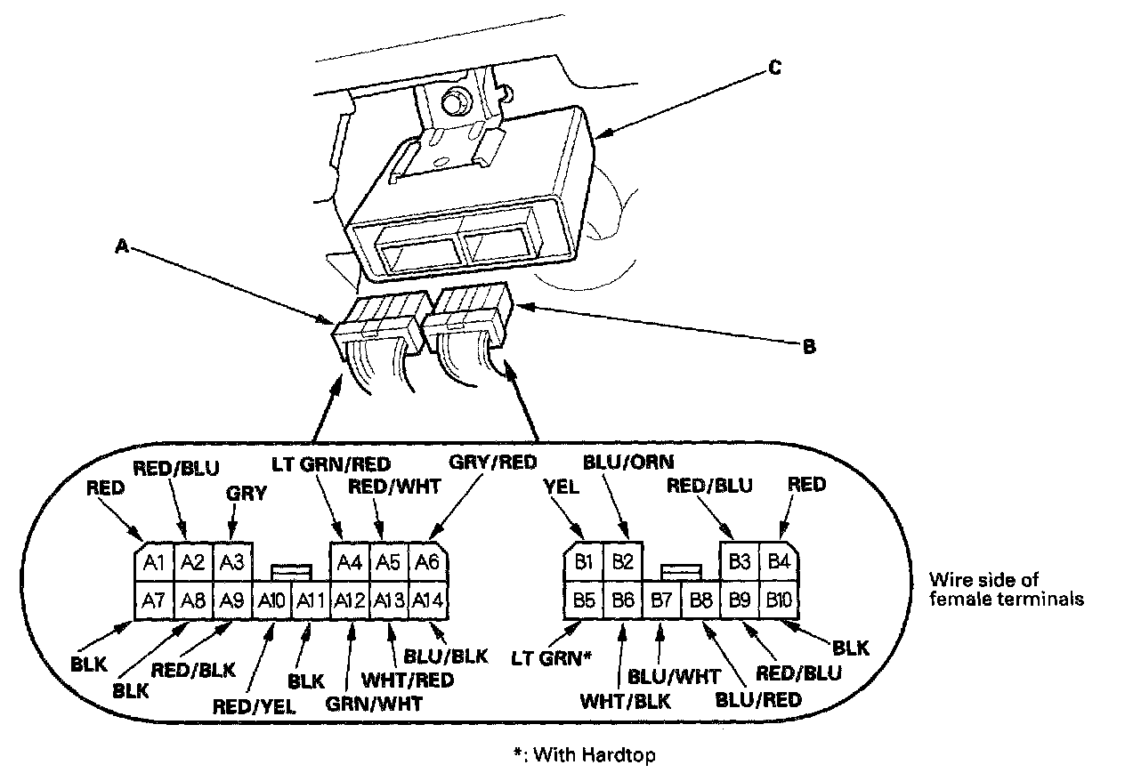 2. Disconnect the 14P connector (A) and 10P connector (B) from the convertible top control unit (C).