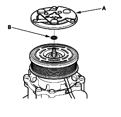 1. Remove the center nut (A) while holding the armature plate with a commercially available A/C clutch holder (B).