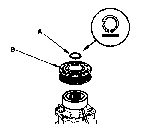 3. If you are replacing the field coil, remove the snap ring (A) with snap ring pliers, then remove the rotor pulley (B). Be careful not to damage the pulley and compressor.