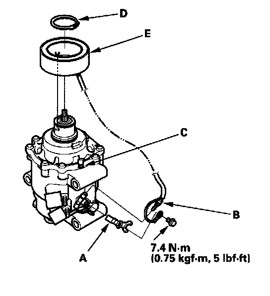 4. Remove the bolt and holder (A), then disconnect the field coil connector (B). Loosen the clamp screw (C) to free the field coil wire. Remove the snap ring (D) with snap ring pliers, then remove the field coil (E). Be careful not to damage the field coil and compressor.
