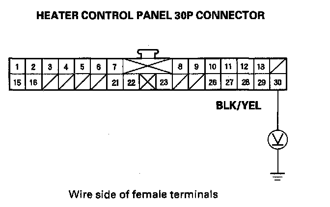 6. Measure the voltage between the No.29 terminal of the heater control panel 30P connector and body ground.