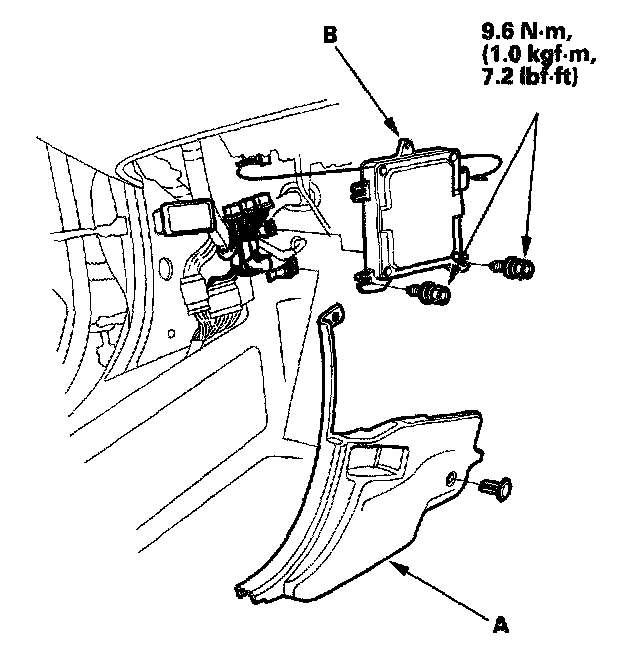 2. Remove the left side kick panel (A) to expose the ECM (B).