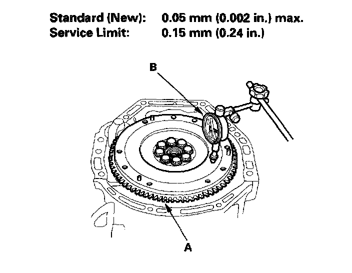 Measure the flywheel (A) runout using a dial indicator (B) through at least two full turns with the engine installed. Push against the flywheel each time you turn it to take up the crankshaft thrust washer clearance. If the runout is more than the service limit, replace the flywheel, and recheck the runout. Resurfacing the flywheel is not recommended