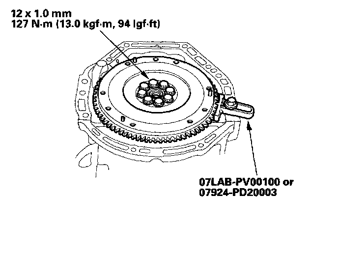 Install the special tool, then torque the flywheel mounting bolts in a crisscross pattern in several steps