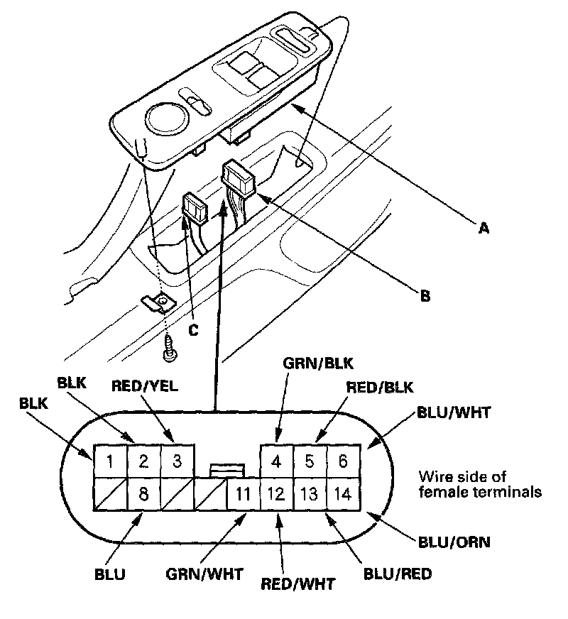 3. Disconnect the 14P connector (B) and the 10P connector (C) from the power window master switch.