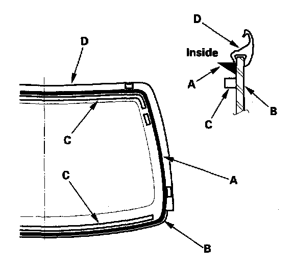 21. Put the cartridge in a caulking gun, and run a bead of adhesive (A) around the edge of the glass (B) between the rubber dam (C) and molding (D) as shown. Apply the adhesive within 30 minutes after applying the glass primer. Make a slightly thicker bead at each corner.