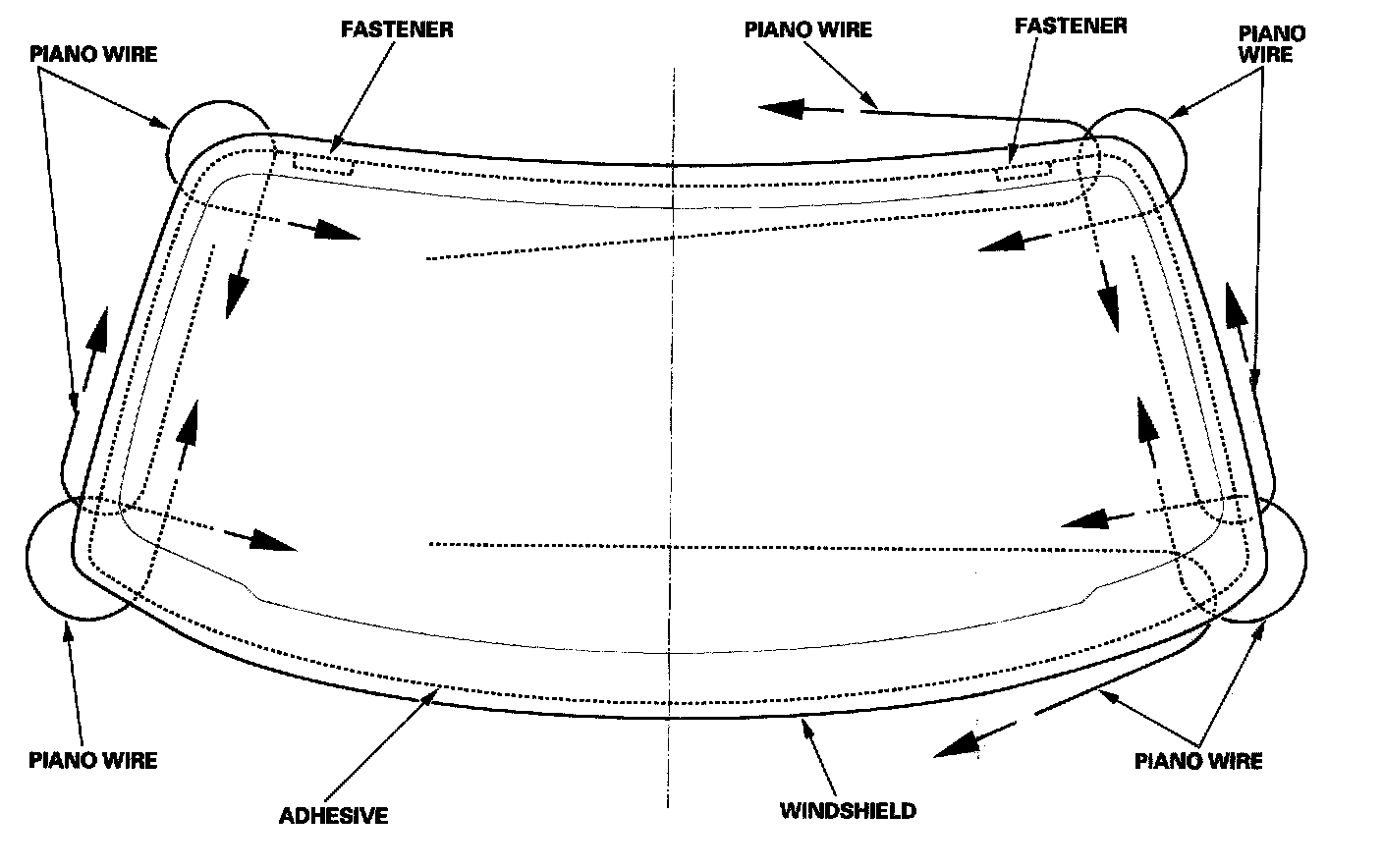Slip piano wire through the adhesive at each position as shown, and pull it back as indicated by the arrows.