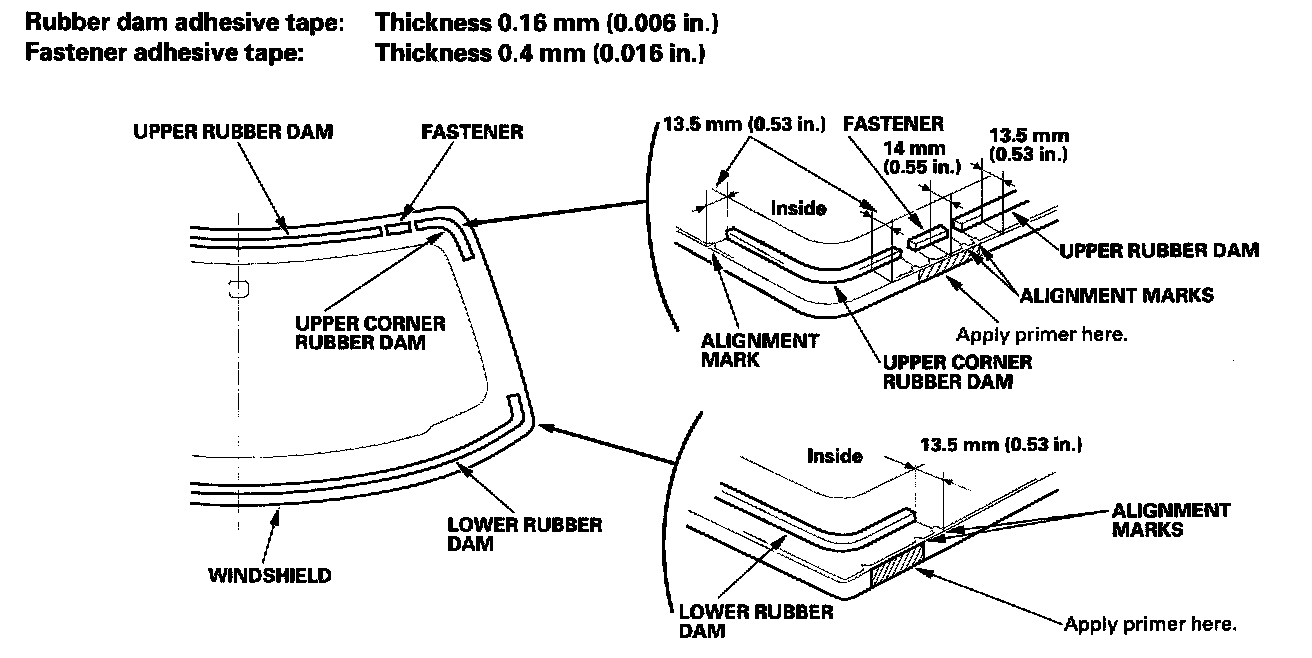 - To attach the molding, apply primer to the areas between the alignment marks of the windshield.