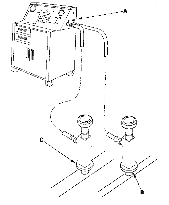 1. Connect a R-134a refrigerant recovery/recycling/charging station (A) to the high-pressure service port (B) and the low-pressure service port (C), as shown, following the equipment manufacturer's instructions.