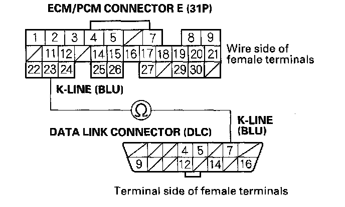 10. Check for continuity between DLC terminal No.7 and ECM/PCM terminal E23.