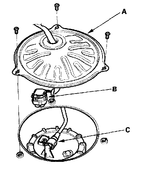 8. Remove the strainer case (A), the fuel gauge sending unit (B), and the wire harness (C).