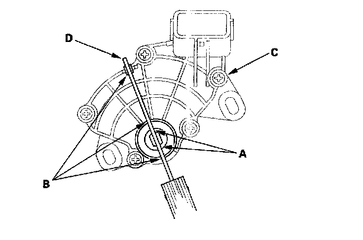 7. Align the cutouts (A) on the rotary-frame with the neutral positioning cutouts (B) on the transmission range switch (C), then put a 2.0 mm (0.08 inch) feeler gauge blade (D) in the cutouts to hold the switch in the N position.