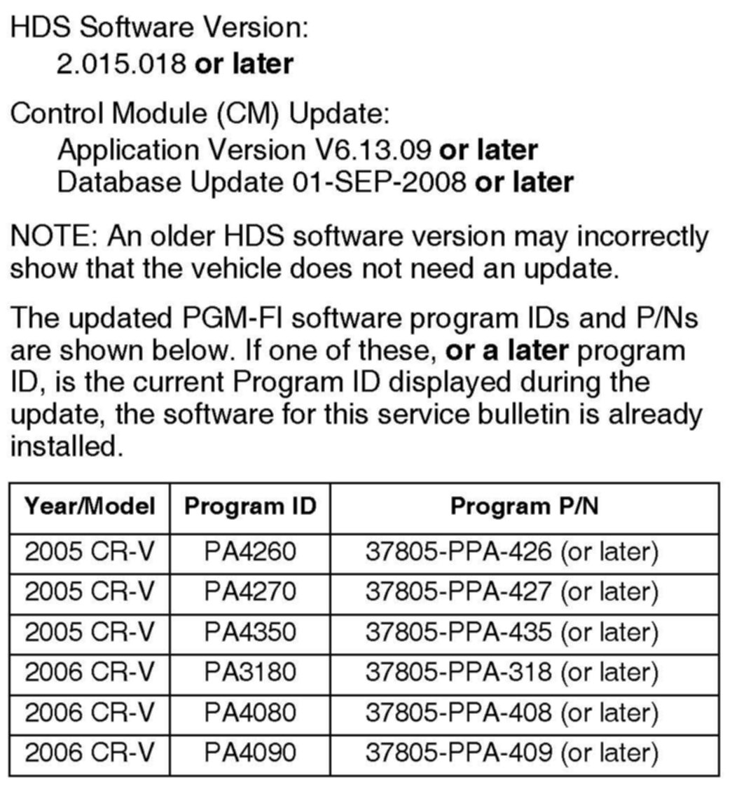 Update the PGM-FI software with the HDS. Refer to Service Bulletin 01-023, Updating Control Units/Modules.