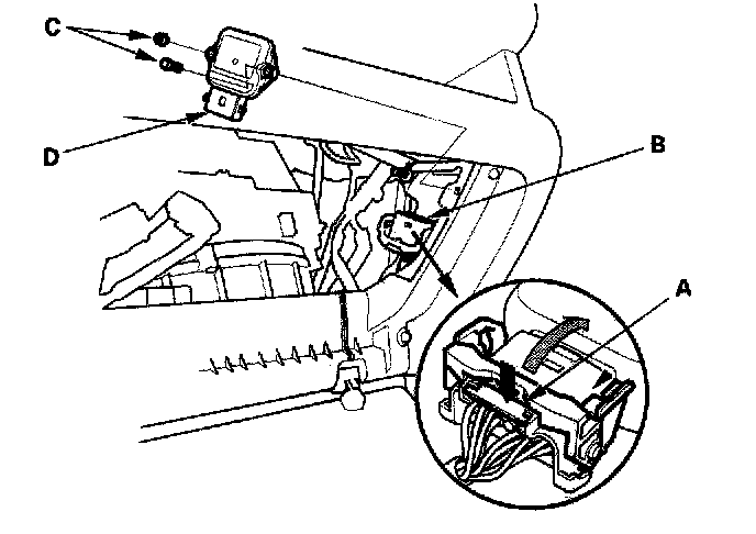 3. Remove the bolts (C), and the throttle actuator control module (D).