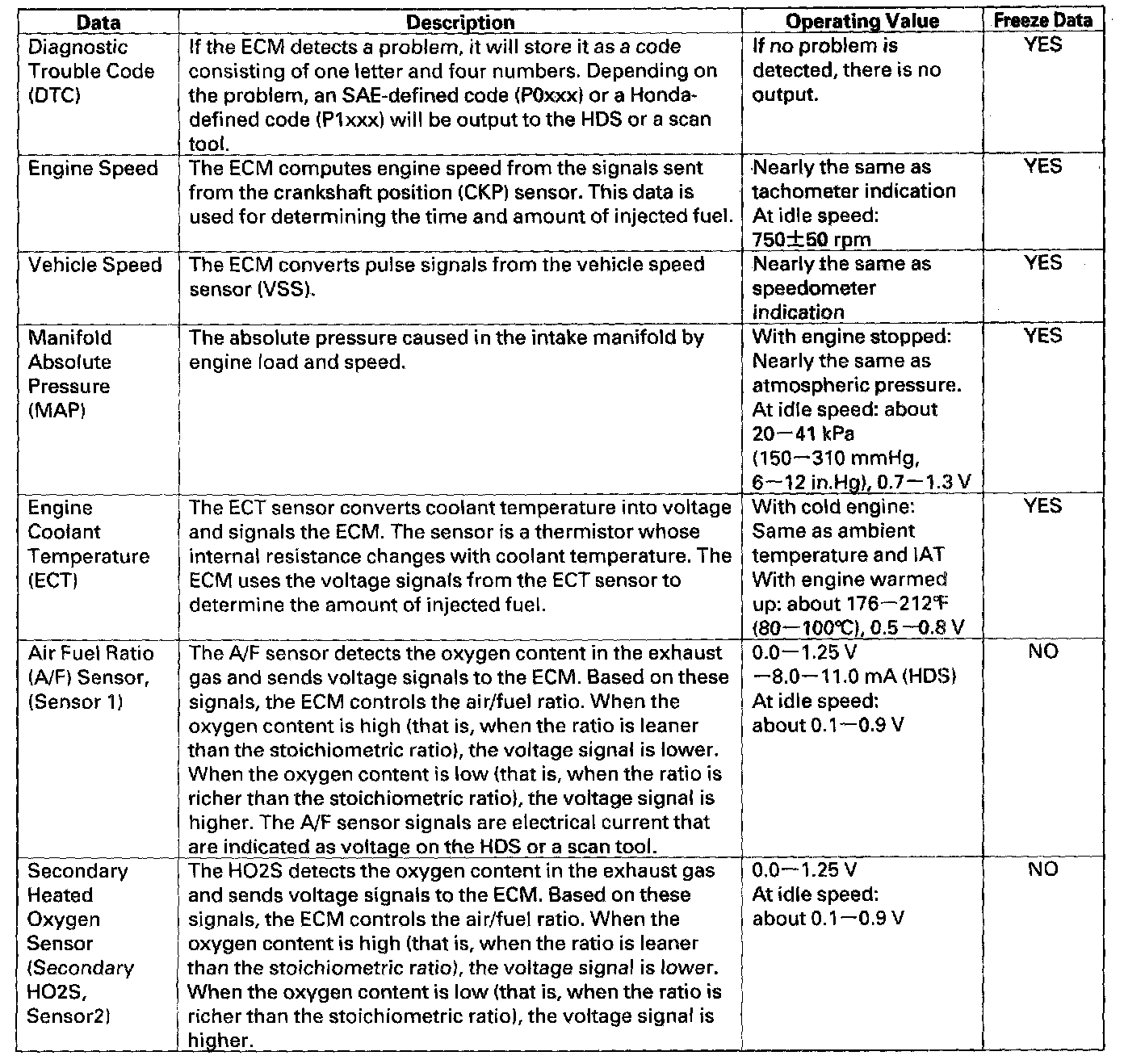 You can retrieve data from the ECM by connecting the HDS or a scan tool to the data link connector (DLC). The items listed in the table above conform to SAE recommended practice. The HDS also reads data beyond that recommended by SAE to help you find the causes of intermittent problems.