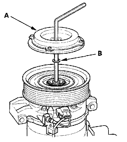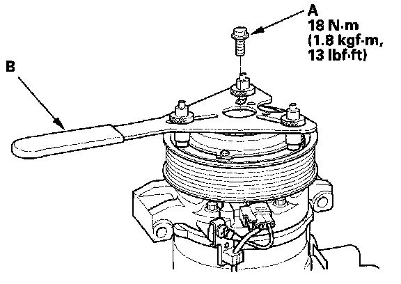 1. Remove the center bolt (A) while holding the armature plate with a commercially available A/C clutch holder (B).