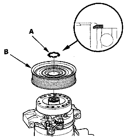 3. If you are replacing the field coil, remove the snap ring (A) with snap ring pliers, then remove the rotor pulley (B). Be careful not to damage the rotor pulley and A/C compressor.
