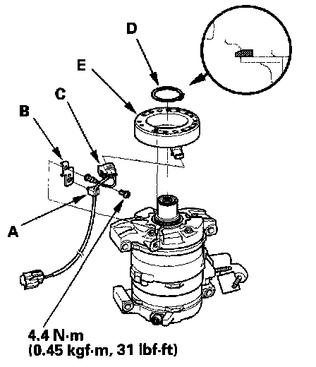 4. Remove the screw, the wire harness clip (A), and holder (B), then disconnect the field coil connector (C). Remove the snap ring (D) with snap ring pliers, then remove the field coil (E). Be careful not to damage the field coil and A/C compressor.