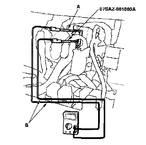 3. If you cannot get to the wire side of the connector or the wire side is sealed (A), disconnect the connector and probe the terminals (B) from the terminal side. Do not force the probe into the connector.