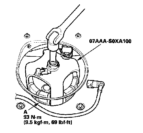 7. Using the special tool, loosen the fuel tank unit locknut (A).