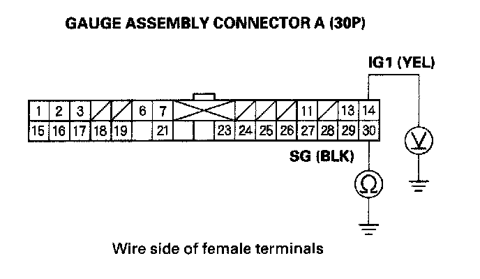 10. Turn the ignition switch OFF, and check for continuity between A30 terminal (BLK) and ground under all conditions. There should be continuity. If the test result is different, check for a poor ground (G502) or an open in the wire.