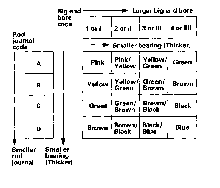 4. Use the big end bore codes and rod journal codes to select appropriate replacement bearings from the table.