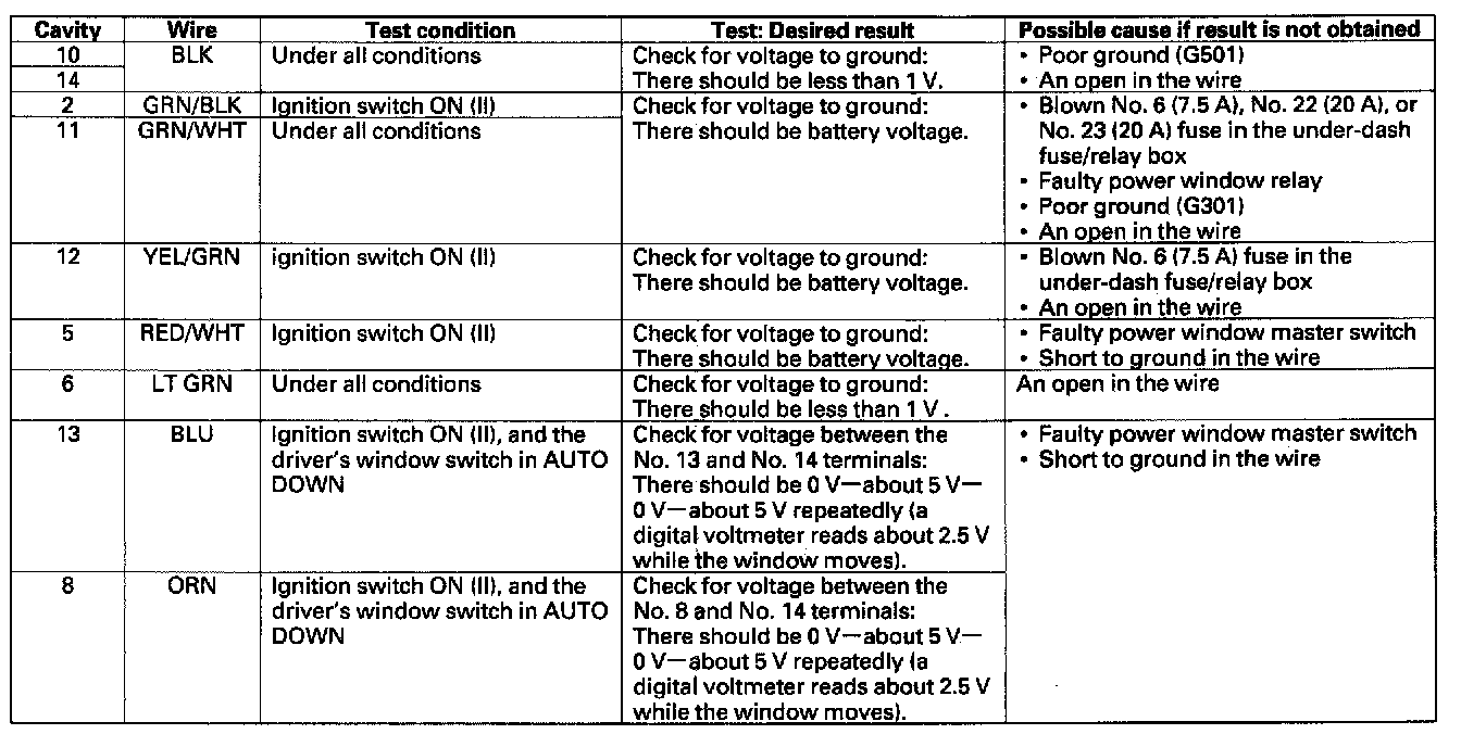 Master Switch Input TestNOTE: The power window control unit is built into the power window master switch, and it only controls the driver's window operations.