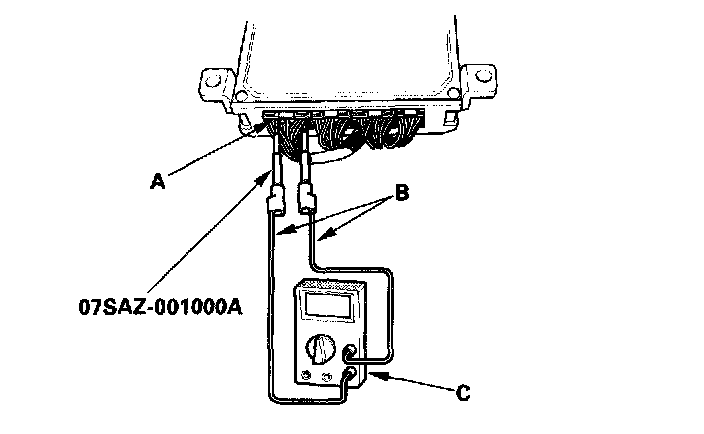 1. Connect the backprobe adapters (A) to the stacking patch cords (B), and connect the cords to a digital multi meter (C).