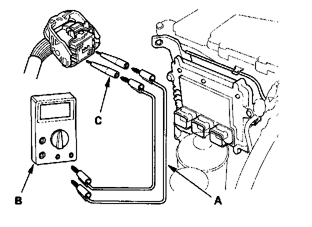 4. Connect one side of the patch cord (A) terminals to a commercially available digital multimeter (B), and connect the other side of the patch cord terminals to a commercially available banana jack (Pomona Electronics Tool No.3563 or equivalent) (C).