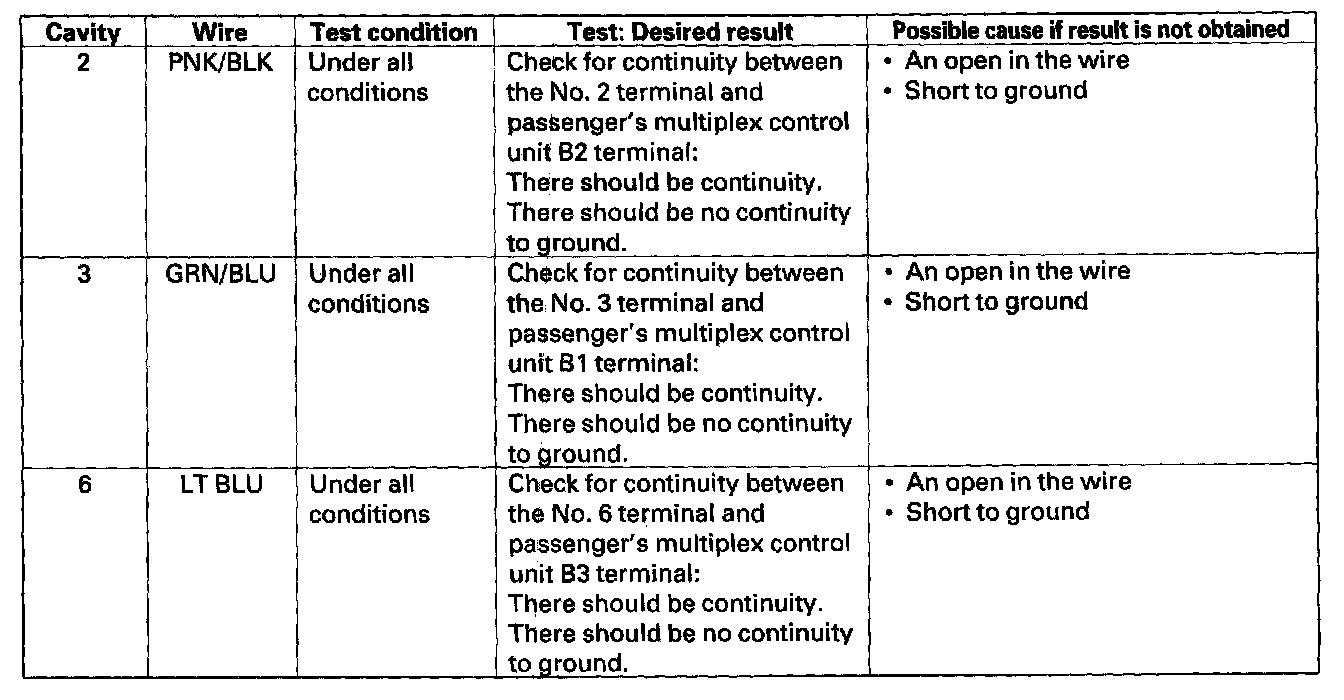 4. Reconnect the connector to the control unit, and make these input tests at the connector.