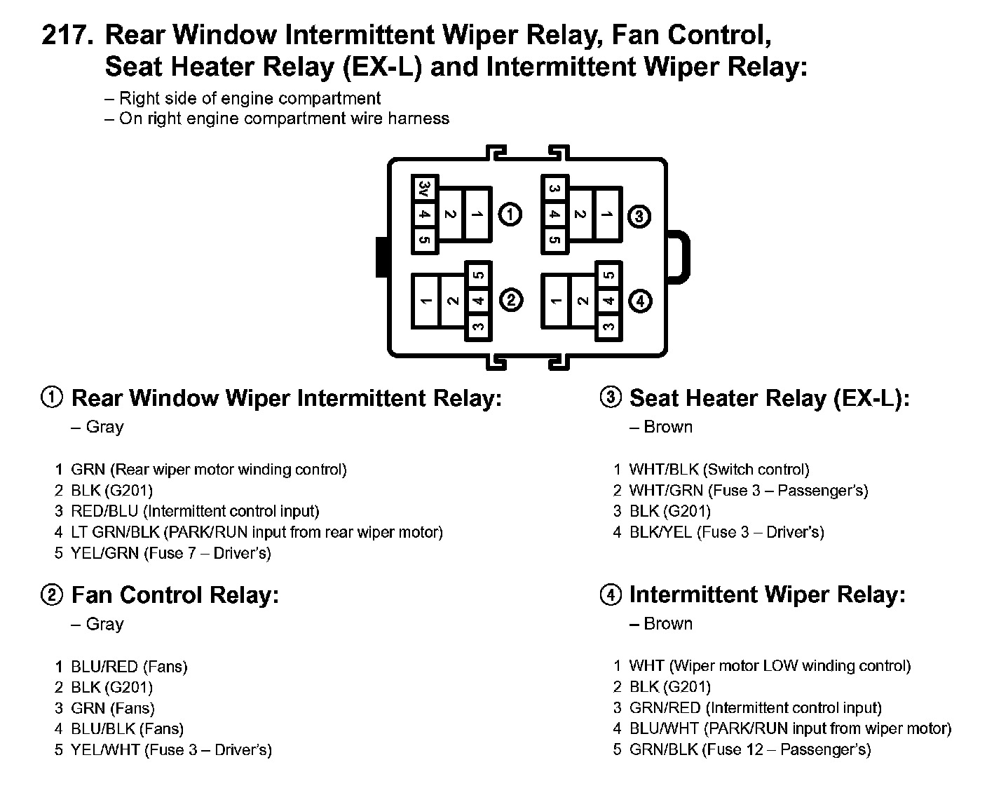 217. Rear Window Intermittent Wiper Relay, Fan Control, Seat Heater Relay (EX-L) And Intermittent Wiper Relay::