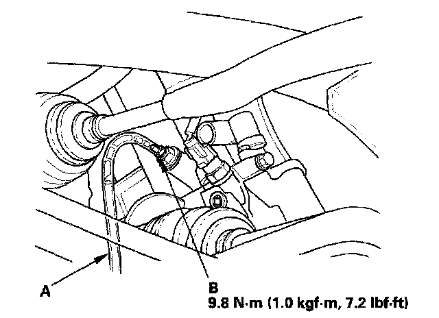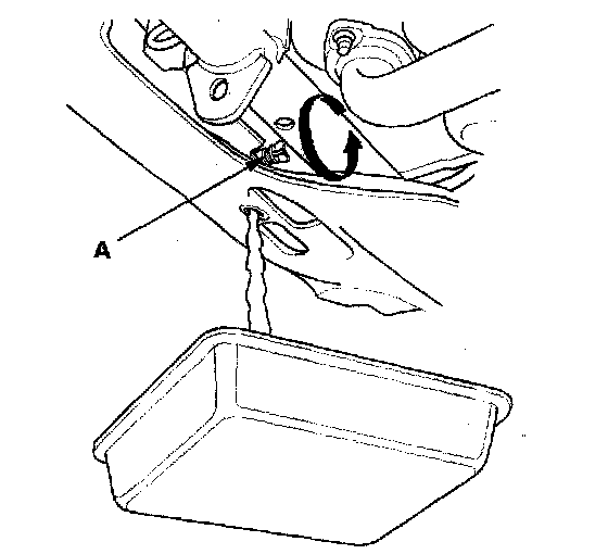4. Install a rubber hose (A) on the drain bolt (B) located at the rear of the engine block, then loosen the drain bolt.