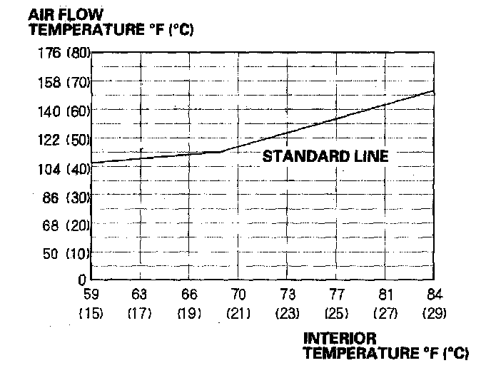 21. Set the climate control or heater control panel to maximum heat, and select high speed heat mode on the rear control panel. Measure the temperature of the air from the rear floor vent for 2 or 3 minutes. Make sure the temperature is above the standard line of the graph as shown. If the temperature is below the standard line, repeat steps 15 through 18 several more times. Then loosely install the radiator cap and recheck.