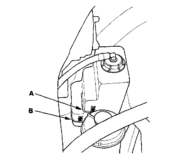 1. Look at the coolant level in the coolant reservoir. Make sure it is between the MAX mark (A) and MIN mark (B).