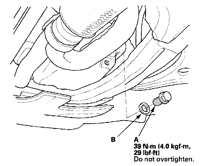 3. Reinstall the drain bolt with a new washer (B).