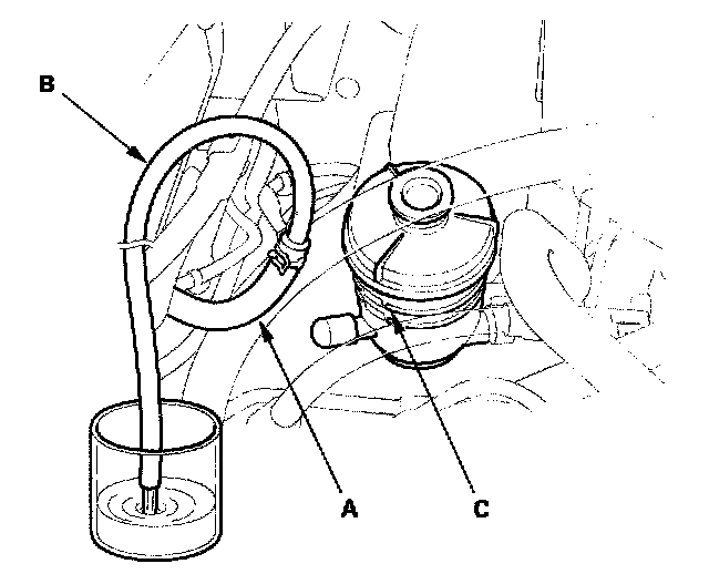 2. Connect a hose (B) of suitable diameter to the disconnected return hose, and put the hose end in a suitable container.