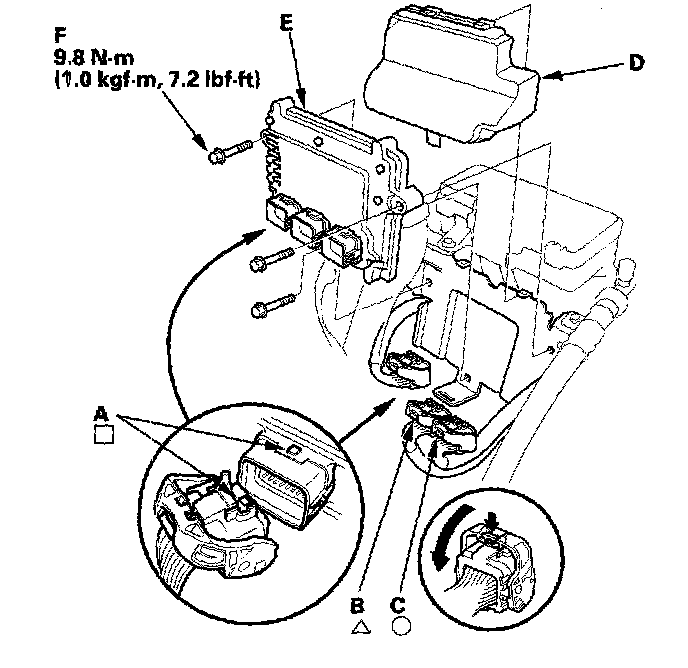 NOTE: PCM connectors A, B, and C have symbols (A= , B= , C= ) embossed on them for identification.