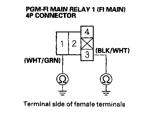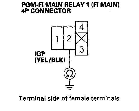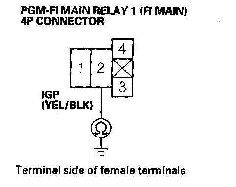 27. Check for continuity between body ground and PGM-FI main relay 1 (FI MAIN) 4P connector terminals No.1 and No.3 individually.