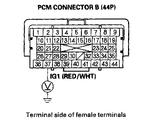 47. Measure voltage between PCM connector terminal B37 and body ground.