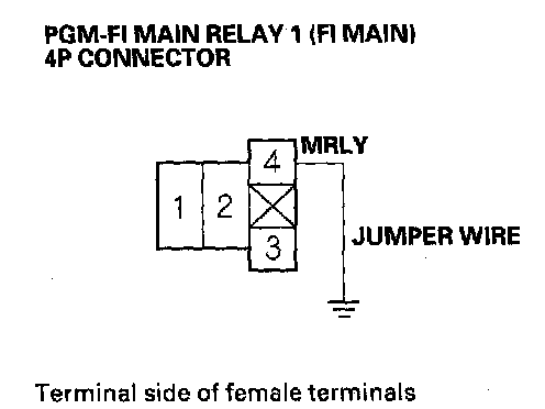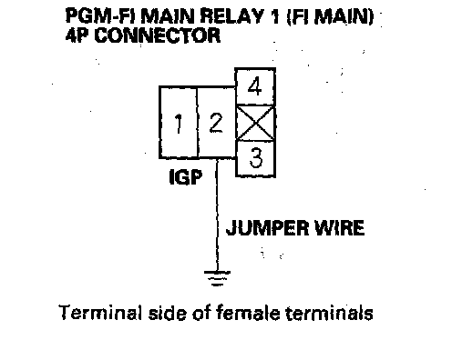 62. Connect PGM-FI main relay 1 (FI MAIN) 4P connector terminal No.2 to body ground with a jumper wire.