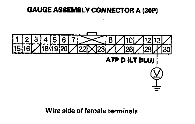 5. Shift to the P position, and check for voltage between gauge assembly connector terminal C1 (BLU/BLK) and body ground. There should be 0 V in the P position. There should be battery voltage in any other shift lever position.