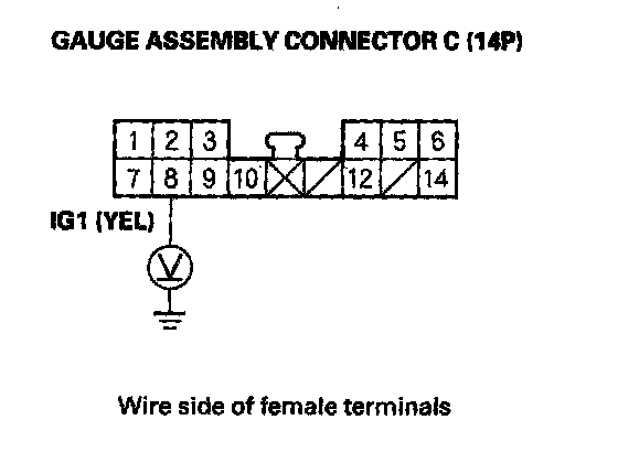 13. Check for voltage between terminal C8 (YEL) and body ground with the ignition switch ON (II). There should be battery voltage. If there is 0 V, check for a blown No. 9 (10 A) fuse in the fuse in the driver's under-dash fuse/relay box or an open in the wire.